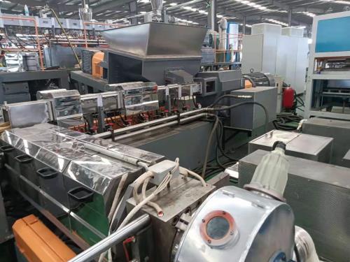 瀝青改性劑造粒機_佳德塑機:瀝青改性造粒機:密煉機----提升機------雙腕喂料機----------單螺桿造粒機--------水環(huán)造粒機---------離心脫水機------風冷加長振動篩-----成品料倉改性瀝青 PP+炭黑低煙無鹵系列等塑膠原料的生產(chǎn),瀝青改性造粒機模面熱切等系統(tǒng)將密煉機撹好的原料經(jīng)雙腕擠入造粒機內,后經(jīng)單螺桿擠出后切成顆粒,使用對水環(huán)罩把物料通過水泵在不銹鋼管道送到離心脫水機內,經(jīng)過離心脫水機把水分排出,把拖干的物料送到振動篩,使用振動篩把連粒的、